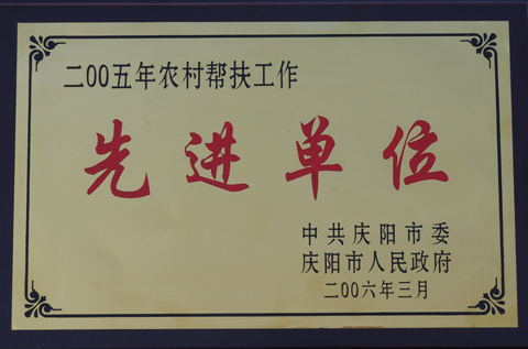 2005年,我局在农村帮扶工作中,认真贯彻中央、甘肃省扶贫工作会议精神,全面落实帮扶工作责任制,积极实施“321”帮扶工程,在基础设施建设、农业科技推广、农村劳动力培训输转、改善乡村办学条件及北部山区抗旱救灾等方面,做了大量工作,为全面建设社会主义新农村做出了贡献。为此庆阳市市委、市政府决定,授予我局“2005年农村帮扶工作先进单位”。这是我局第二次获此表彰。