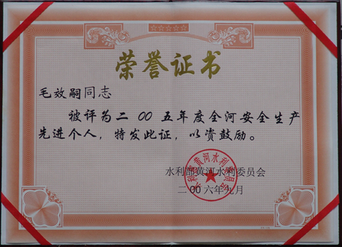 毛效嗣同志荣获“全河安全生产先进个人” 荣誉称号