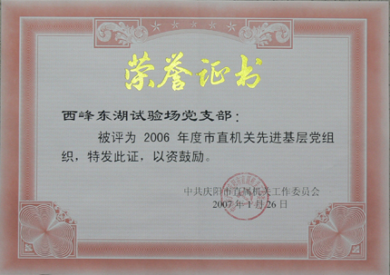 西峰局东湖水土保持试验场党支部荣获“2006年庆阳市市直机关先进基层党组织”光荣称号。
