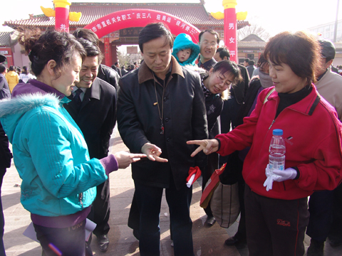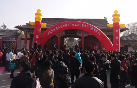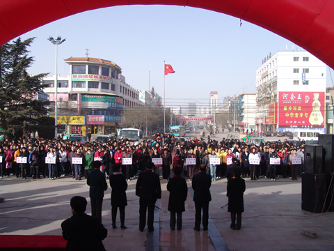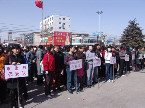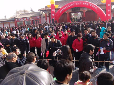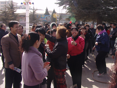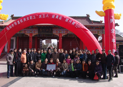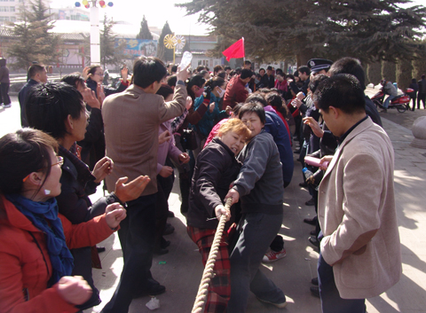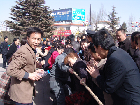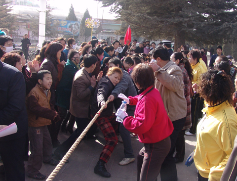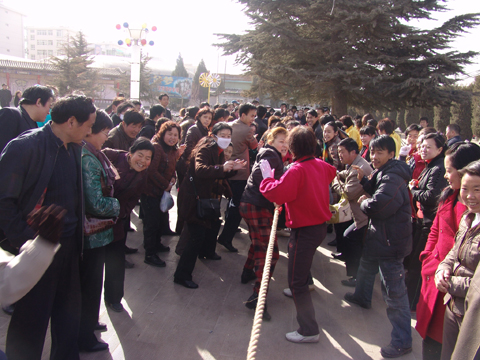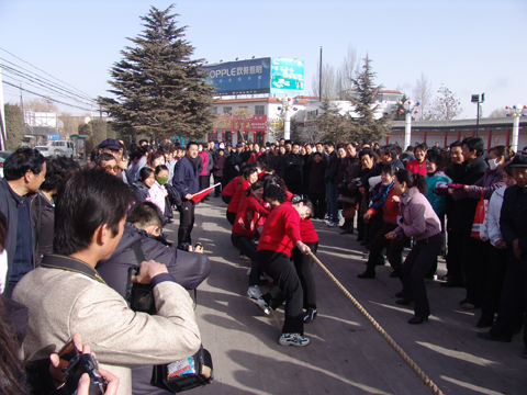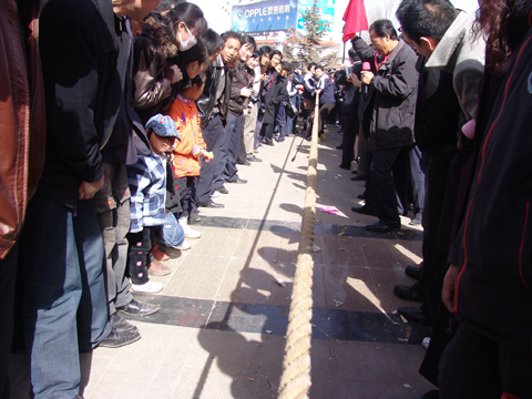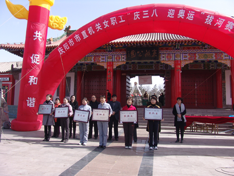 3月1日上午,庆阳市风和日丽,春意盎然,由庆阳市妇联、总工会、体委组织的“庆三八、迎奥运”拔河比赛在东湖公园门前隆重举行,来自庆阳市直单位、驻庆单位的参赛者共208人参加比赛,近3000名群众现场助威。比赛采用小组淘汰赛和冠军争夺循环赛两个环节,现场气氛十分热烈。