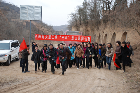 为纪念“三八”国际劳动妇女节100周年,2010年3月8日,西峰局组织全体女职工共计45人,在工会主席宫春旺、党群办主任张志义及妇工主任的带领下赴南小河沟试验监测站春游并举行登山竞赛活动。