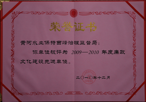 近日,从黄河水利委员会传来喜讯,西峰治理监督局荣获“全河2009-2010年度廉政文化建设先进单位”,并颁发了荣誉证书。