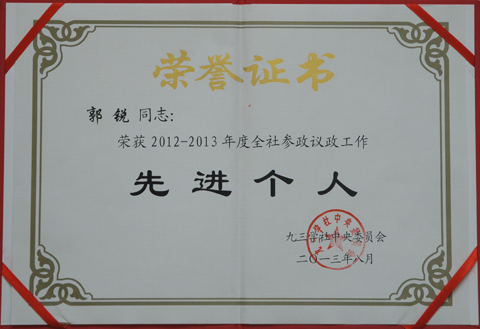 在庆阳市委统战部的领导下,在我局的大力支持下,九三学社各项工作取得显著成绩。局副总工郭锐同志被九三学社中央委员会评为2012—2013年度全社参政议政工作先进个人,2013年全社先进组工干部。