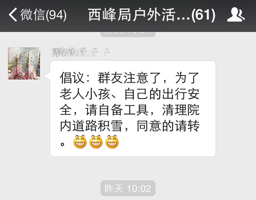 一场雪,将整个世界漂白,这个城市简单成了一个颜色。雪给人们带来无限美好享受和遐想的同时,也给出行的安全带来了无情的影响。昨日,西峰治理监督局户外微信群贴出一则倡议:群友注意了,为了老人小孩、自己的出行安全,请自备工具,清理院内道路积雪。