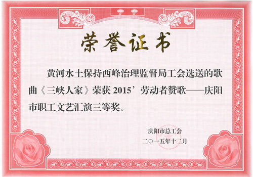 12月19-20日,庆阳市政府礼堂举行了职工文艺汇演,由黄河水土保持西峰治理监督局工会选送的歌曲《三峡人家》(演唱者:薛志敏)荣获2015“劳动者赞歌”—庆阳市职工文艺汇演三等奖。