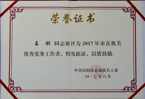 近日,庆阳市直属机关工委在市政府礼堂举行了市直机关庆祝建党96周年表彰会,会上,西峰局第二党支部书记王刚荣获2017年市直属机关“优秀党务工作者”荣誉称号。