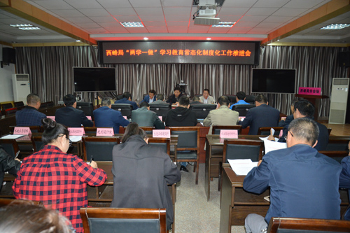 9月28日, 西峰治理监督局召开“两学一做”学习教育常态化制度化工作推进会,贯彻落实中央及上级有关决策部署,推进全面从严治党向纵深发展。局党组书记、局长赵安成对推进“两学一做”学习教育常态化制度化提出具体要求,并以《强化使命担当 勇于开拓创新 以更大力度更实举措争做合格党员》为题,为全局副科级以上干部和全体党员讲了专题党课。局党组成员、副局长张西宁对“两学一做”学习教育常态化制度化工作进行了安排部署,局党组成员、副局长刘斌主持会议。