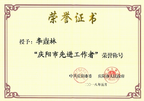 2018年5月3日,在庆阳宾馆会议礼堂召开庆阳市第三届劳动模范和先进工作者表彰大会,西峰局李垚林同志被授予“庆阳市先进工作者”荣誉称号。