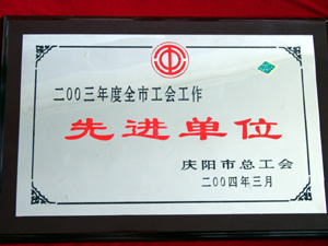 2004年3月,西峰治理监督局工会被中共庆阳市总工会评为全市工会工作先进单位,在近期庆阳市总工会工作会议上得到表彰奖励,并颁发了奖牌。