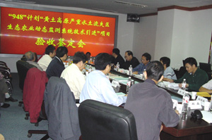 2003年9月3日,水利部国际合作与科技司在西安组织召开 “黄土高原严重水土流失区生态农业动态监测系统技术引进”项目(“948”项目)验收暨鉴定会。水利部国际合作与科技司、科技推广中心、水土保持监测中心、黄委国科局、黄河上中游管理局的有关领导出席了会议。会议邀请了中国科学院朱显谟院士、北京大学马蔼乃教授、中科院水土保持研究所李锐研究员、清华大学王光谦、翁文斌教授、中科院寒区旱区研究所董治宝研究员等专家。与会专家在审查技术文件、听取项目汇报、观看现场演示和质疑后,一致认为该项目完成了合同任务,尤其在监测范围、内容、三维可视化信息系统和土壤侵蚀评价模型研究等方面超额完成了合同要求。