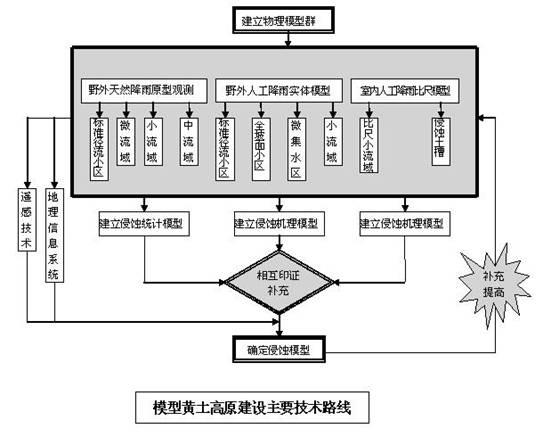 模型黄土高原建设的技术路线是:通过建立野外不同空间尺度的天然降雨原型小流域观测、建立野外人工降雨实体小流域模型和室内人工降雨比尺模型,结合遥感技术和地理信息系统,采用实体模拟理论和技术、测控技术和信息技术,把水土流失和水土保持重大的理论与技术问题体现在相关物理模型上,通过对物理模型的试验(复演、模拟、试验)与观测,研究解决这些问题的理论和方法。