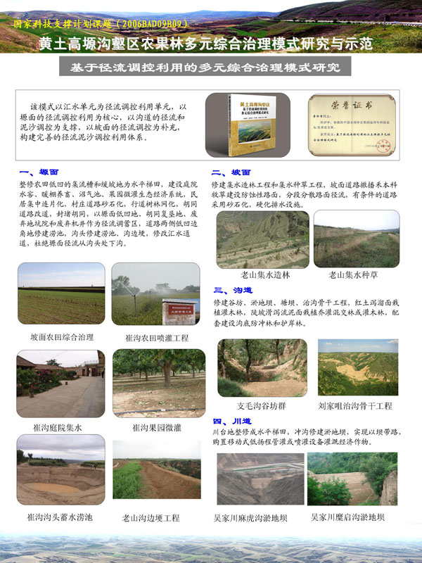 在黄河水土保持生态工程齐家川示范区和砚瓦川项目区建设中,提出的基于径流调控利用的多元综合治理模式,根据高塬沟壑区塬、坡、沟、川的特点,提出了20种径流泥沙调控利用范式,并在齐家川示范区和砚瓦川项目区建设中得到示范推广。