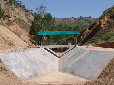 测站建设工程包括观测设施、测房、测棚、砖砌围墙、石子道路等。观测断面布设于董庄沟沟口,控制面积1.15km2。测流设施采用三角量水槽,高2.1m,长20m,边坡1:1.5,钢筋混凝土结构。主要观测项目包括:降水、径流、泥沙等。