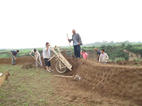 此时的老山村东嘴队建设现场,有30多名村民正在施工,拉土的,夯筑的,形成了一幅壮观的“保塬固沟”图。