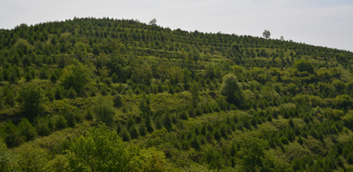 离开砚瓦川监测站,汽车又爬上塬面,沿途一个个苹果园、酥梨园、蜜桃园、葡萄园,挂满了丰收待摘的果实;地埂黄花、紫里透红的花椒篱笆、待采的胡麻在满地金黄色仔瓜的衬托下,如同一幅绚丽多彩的油画。经过40多分钟的车程,我们来到了黄河水土保持生态工程砚瓦川项目区——庆阳市西峰区肖金镇老山综合治理点。车门一开,泥土与青草的芳香,伴随着满眼的绿色扑面而来,纵横交错的千沟万壑,被一排排整齐划一的油松、侧柏、沙棘所装扮;一块块责任田,被一片片绿油菜、马铃薯,金黄的玉米、饱满的大豆、火红的高粱所点缀,把整个董志塬都渲染得色彩斑斓,使金秋季节的砚瓦川如同美丽的山水画。