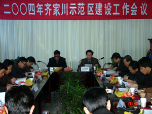 示范区领导小组组长毛效嗣在会上强调,今年示范区要巩固完善已建工程,狠抓再建工程质量,全面提高示范水平。针对2004年示范区面临的梯田建设资金不足的现实。他指出由受益村户自我组织劳力,完成任务,示范区项目以奖代助,保证中央资金兑现到户。同时结合区上其它项目,将中央投资与其它项目投资捆绑使用,在重点部位联合建立精品工程示范片,提高示范效果。并在建设中积极发动村集体与农户自筹资金,鼓励有经济实力的非公有经济实体投资建设,政府提供优惠政策予以扶持。他要求今年要继续巩固完善常绿树种、梯田等示范片,对重点示范工程建设要突出一个“精”字,要体现一个“高”字,并对示范片、点周围环境要进行整治,体现治理与保护、人与自然和谐氛围。