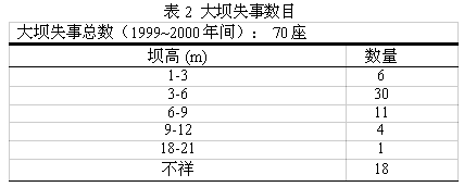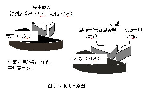 4.2 当前情况 近些年,美国发生了一系列垮坝事件,在1999~2000两年间就发生了70例(见表2)。根据表中统计数据,失事的坝大部分为低矮的小坝。失事原因及失事大坝类型所占比例如图6所示。