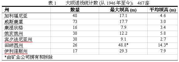 3 大坝的退役、拆除以及河流的恢复3.1 概述 在美国,随着有文献记载的500余座已老化大坝的拆除,大坝拆除(退役)已被大家接受并成为处理已丧失功能的大坝的措施。见表1。