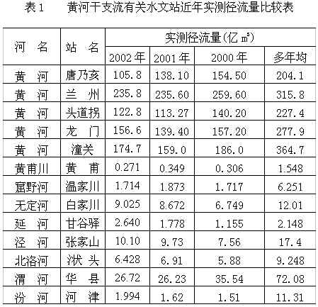 特别是自20世纪90年代后期以来,黄河连年出现枯水,尤其是近几年,黄河干支流来水更枯。龙门站2002年、2001年、2000年径流量分别为156.6、139.4和157.2亿立方米,仅为多年均值的56.4%、50.2%和56.7%(见表)