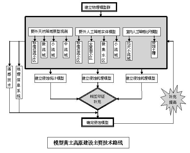 模型黄土高原建设的技术路线是:通过建立野外不同空间尺度的天然降雨原型小流域观测、建立野外人工降雨实体小流域模型和室内人工降雨比尺模型,结合遥感技术和地理信息系统,采用实体模拟理论和技术、测控技术和信息技术,把水土流失和水土保持重大的理论与技术问题体现在相关物理模型上,通过对物理模型的试验(复演、模拟、试验)与观测,研究解决这些问题的理论和方法。