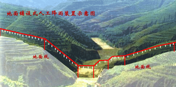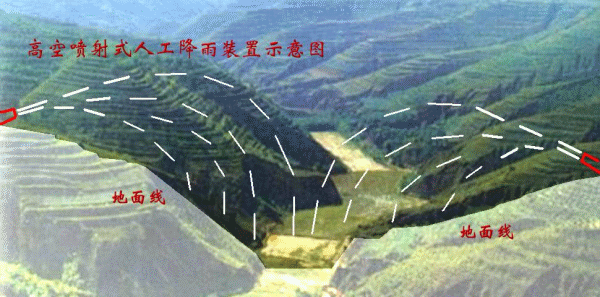 三是高空喷射式(见动画示意图)。在两侧山梁上架设不同口径、不同压力的高压喷头,相对均匀喷洒,实现降雨要求。该方案的优点是架设相对简单,但装置没有先例,需要从头研制,且高空喷洒水分蒸发量大。