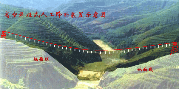 二是高空悬挂式(见动画示意图)。在小流域两侧的山梁上架设钢索,将降雨喷头悬挂其上。该装置的最小高度要满足两侧山梁顶部的降雨要求。该方案的优点是将现有装置机械高移,可以直接建设,装置对地面没有干扰,缺点是架设难度较大,且高空水分蒸发损失较大,需要重新率定。
