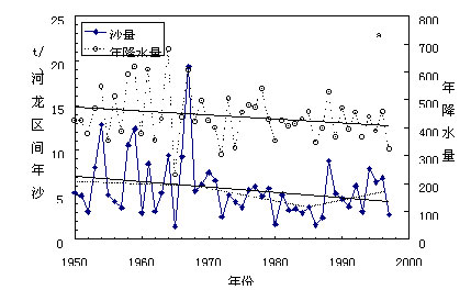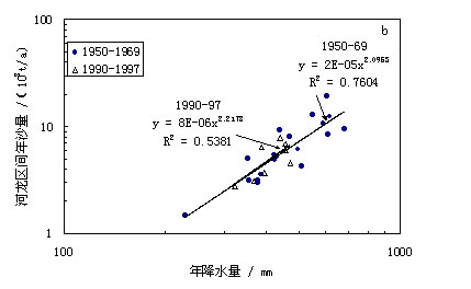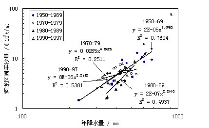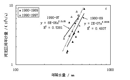 图2c中对于1980年—1989年和1990—1997年间的入黄泥沙量一年雨量关系进行了比较。可以看到,90年代的回归直线位于80年代直线的上方,说明在相同的降雨条件下,入黄泥沙明显增大。进一步分析还表明,80年代的点子与90年代的点子可以用一条直线分开,90年代的点子除1990年外,均位于该直线以上,而80年代的点子除1989年外,均位于该直线以下。
