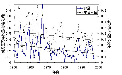由于图1中降水量和入黄沙量的单位不一样,不能对于二者的变化斜率进行直接的比较。为此,我们对于数据进行了标准化,换算为0至1之间,将其历年变化点绘在图1b中,