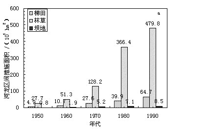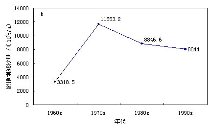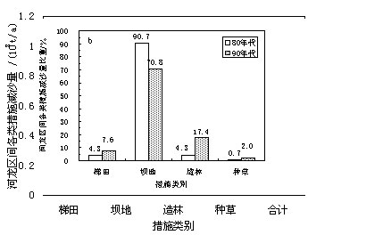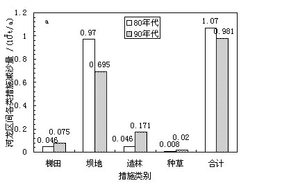 fig.3 the decade variations in the areas of erosion control measures (a) and in the sediment trapped by the checkdams (b)