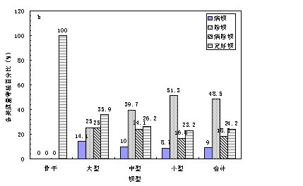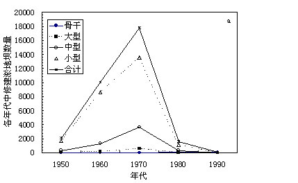 陕西省水土保持局1993年曾对陕北淤地坝的数量和质量进行过系统的调查研究。依据所获数据,我们将陕北淤地坝数量的变化点绘在图5a中。可以看到,从50年代至70年代,陕北大、中小型淤地坝数量都迅速增多,70年代达到最高峰。从70年代到80年代,除兴修了93座骨干坝以外,新修淤地坝数量锐减。淤地坝的拦沙效益是随时间而衰减的,其拦沙寿命仅为10年左右。70年代大量修建的淤地坝,70年代和80年代发挥了巨大效益。然而,由于80年代中修建的淤地坝甚少,70年代所建的淤地坝,到90年代初库容淤损率达77%,大部分已被淤满或成为病险坝,其拦沙有效性已大部分消失,无法再发挥拦沙效益,故90年代淤地坝拦沙量大幅度减少。从图5b中可以看出,除了大型骨干坝质量完好以外,其余坝型的质量状况是十分令人担忧的。病坝、险坝和病险坝的总数达到75.8%,完好坝不足四分之一。修建淤地坝较多的子洲县,1977年前建有淤地坝2007座,到1993年仅存968座;1994年8月的暴雨又破坏了其中的821座,使全县可以发挥良好拦沙效益的淤地坝所剩无几[3]。在这场暴雨中,无定河流域发生了3次洪水,冲毁淤地坝3432座,水库8座,共产沙1.47亿t,较80年代白家川水文站汛期平均沙量增加1亿t以上,使该年白家川站汛期沙量高达2.034亿t。在特大暴雨中淤地坝大量被洪水冲毁,还会使前期拦蓄的泥沙中,有一部分被“释放”,使产沙量大幅度增加,1994年无定河洪水即是一例。