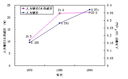 黄河水沙变化基金第二期研究中,曾对人为增沙量进行了估算[7],依据所获成果,我们在图7 中点绘了人为增沙量及人为增沙量与水土保持减沙量之比(以百分比计)的时间变化。可以看到,从70年代以来,人为增沙量和和人为增沙与水土保持减沙之比值均呈增加趋势。在90年代中,人类增沙已相当于水土保持减沙量的22%,即将近22%的水土保持减沙效益已被人为增沙所抵消。这不能不引起人们的高度重视。