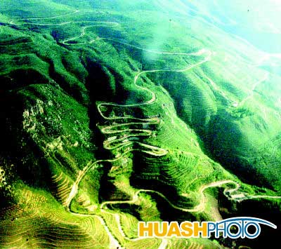 空中俯视黄土高原,道路弯弯曲曲(西宁)