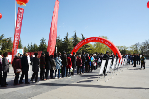 3月22日,西峰局和庆阳市水务局、黄委西峰水文局等单位联合在西峰东湖公园门前组织开展了宣传活动。在广场搭建拱门、悬挂横、条幅,展示图版,设立咨询点,营造了浓厚的宣传氛围,进行了隆重的宣传纪念活动。宣传活动采取了发放宣传资料及节水纸杯、玻璃水杯、小气球等小纪念品相结合的方式,增加了宣传活动的吸引力和趣味性,现场市民热情高涨,踊跃参与。活动共计发放宣传单2000余份,宣传折页500份,水法律法规(简明读本)100本,发放宣传画10套,中国水利报《世界水日·中国水日》特刊200份。接待咨询群众1000余人次,邀请庆阳电视台对宣传活动进行了现场采访,并在《庆阳新闻》中进行了专题报道,扩大了宣传效果。